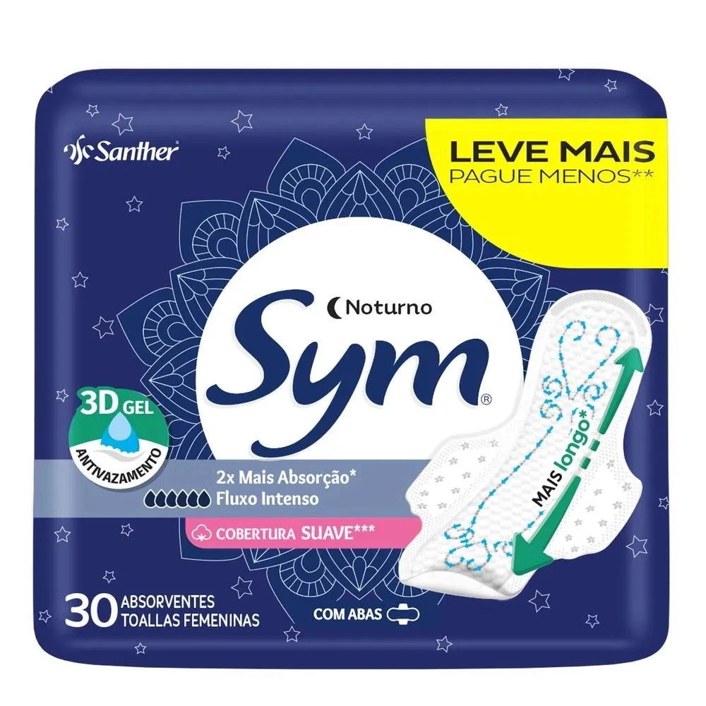 HIGIENE E BELEZA>HIGIENE INTIMA>ABSORVENTE>Absorvente Sym Premium 3D Noturno Cobertura Suave Com Abas 30 und